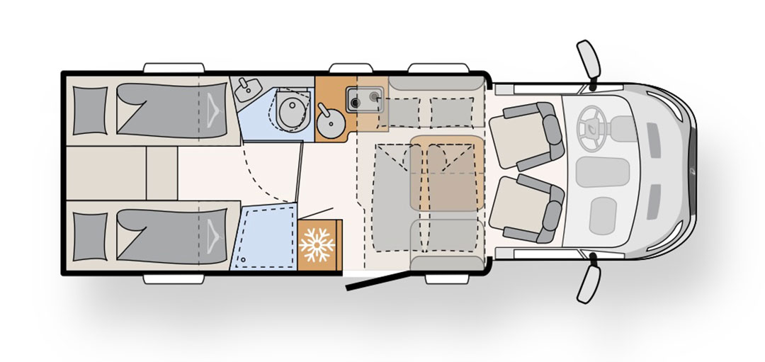 Detty ist das perfekte Wohnmobil für Familien oder Paare. Mit der modernen und hellen Ausstattung wird eine Atmosphäre geschaffen, die zum Wohlfühlen einlädt. Ein besonderes Highlight ist die Face-to-Face-Sitzgruppe. Das Wohnmobil hat eine separate Dusche und durch die Tür des Bades, die auch zur Küchenzeile hin geschlossen werden kann, entsteht ein gemütlicher Raum nicht nur zum Schlafen, sondern auch zum Umziehen oder als Rückzugsort.